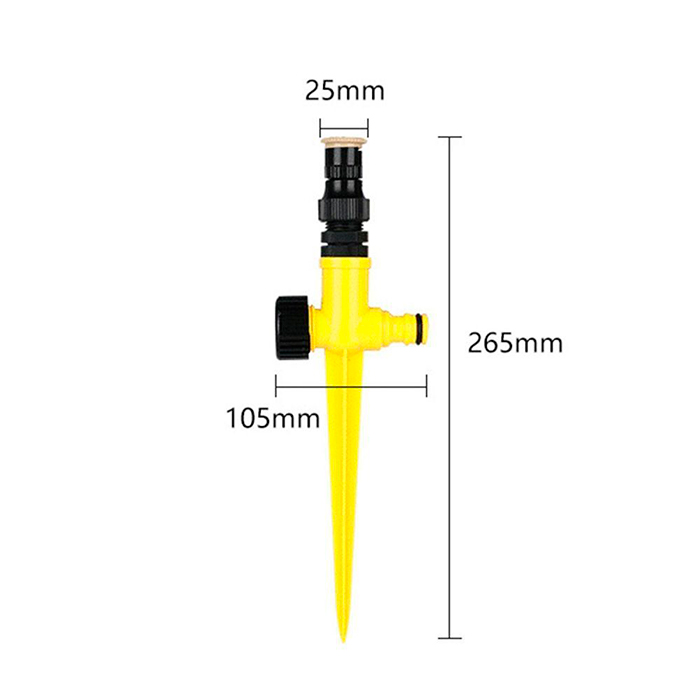 26,4 x 10,4 cm (bendras dydis); 14 cm (dalis, kurią įkišate į žemę); 2,5 cm (antgalio ir tandeminio antgalio skersmuo); 3,5 x 3 x 1,5 cm (antgalio, jungiančio laistymo sistemą ir sodo žarną, dydis).