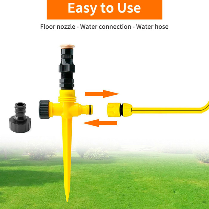 Laistymo sistema turi 2 jungtis – viena skirta sodo žarnai įkišti, kita – kitai laistymo sistemai prijungti, kad būtų galima laistyti tandeminiu būdu. Jungtis tinka visoms standartinėms žarnoms. Purškimo kampas reguliuojamas sukant antgalį.