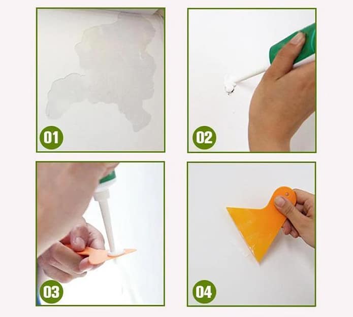 Tiesiog išspauskite stebuklingą pastą ant pažeistos vietos ir naudokite pridėtą mentelę, kad tolygiai paskirstytumėte ją ant pažeistos vietos. Leiskite išdžiūti, o tada, jei norite, galite paviršių išlyginti švitriniu popieriumi. Sutaisyta sienos dalis bus tvirta kaip akmuo, ir jūs netgi galite į ją įkalti vinį ar įsukti varžtą. Laikys kaip vinis!