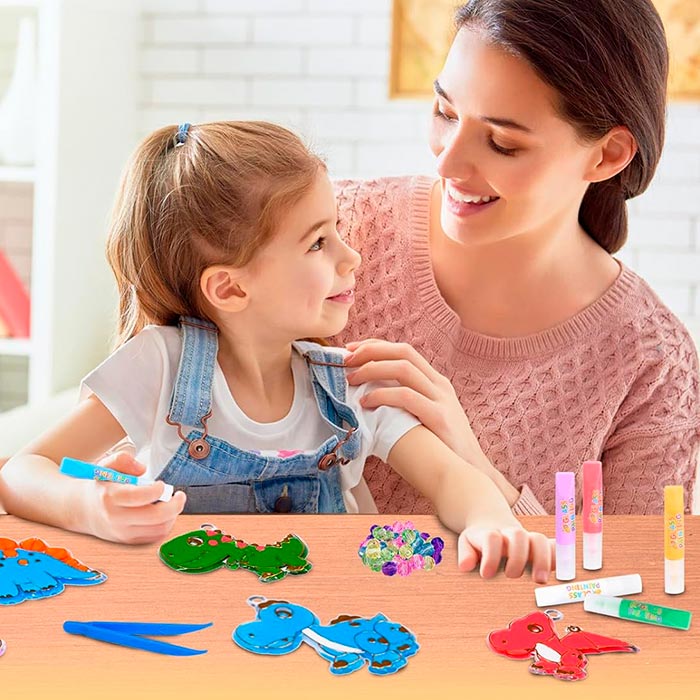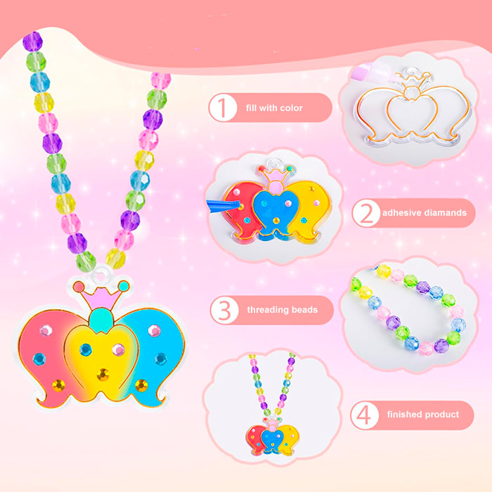 Šis turtingas pakabukų rinkinys apima 6 dizainus, 6 skirtingas spalvas, 6 pakabukų grandinėles, 1 pincetą, 1 pakelį deimantų, 1 pakelį spalvotų karoliukų ir 1 ilgesnį siūlą!