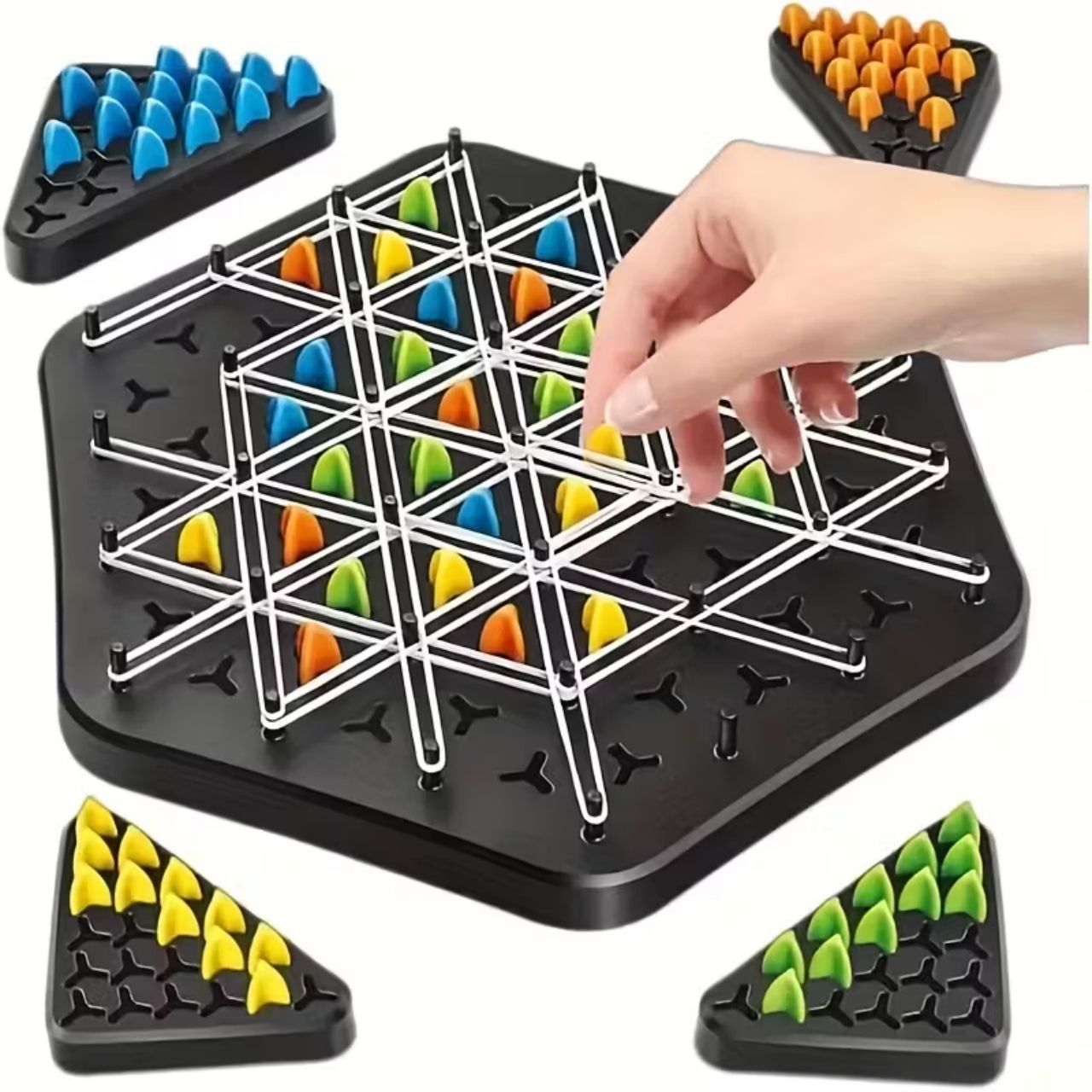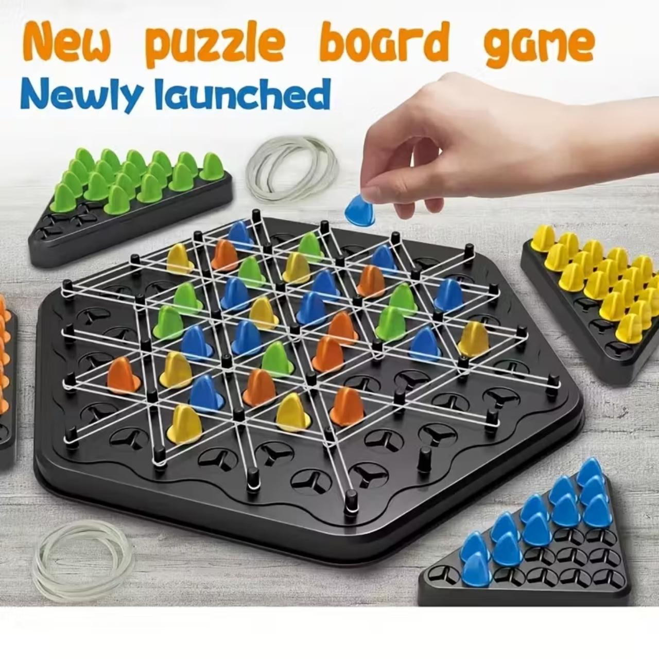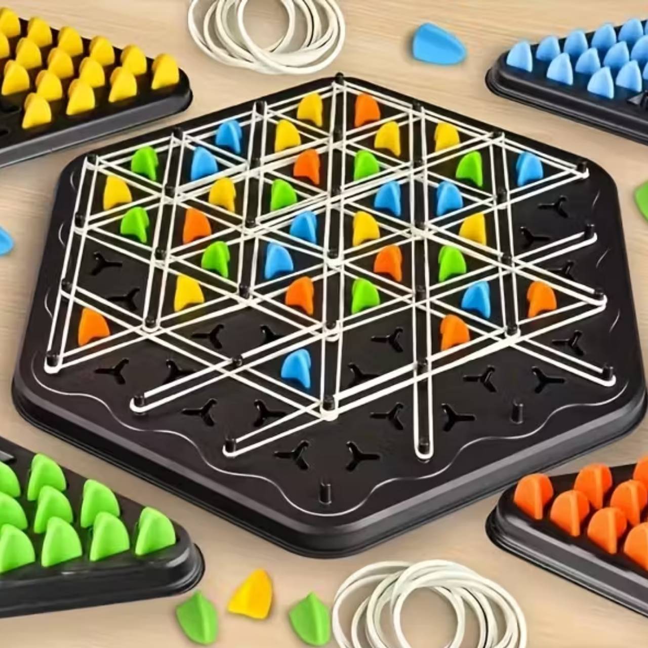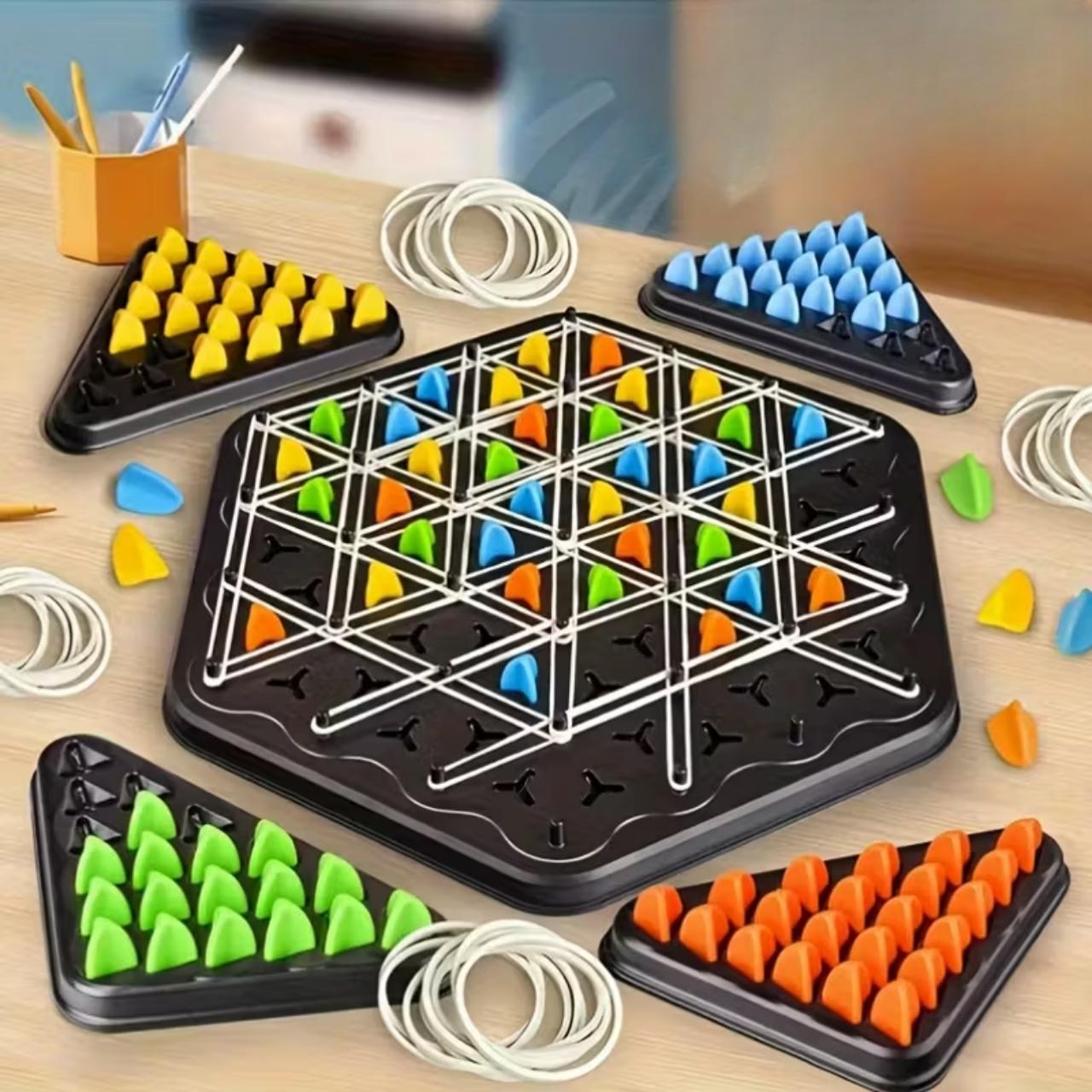 1x žaidimo lenta, 4x mažesnės lentos, 4 spalvų figūros, gumelės