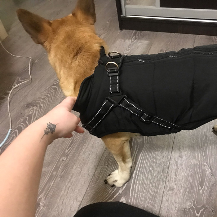 Uždėkite apsiaustą pro priekinių letenų skylutes ir užsisekite užtrauktuką. Sureguliuokite dirželius, kad jūsų šuniukui apsiaustas gerai priglustų. Pritvirtinkite pavadėlį tam skirtoje vietoje, kuri yra kailio nugaros viduryje. Rekomenduojame skalbti rankomis. Nerekomenduojame džiovinti džiovyklėje.