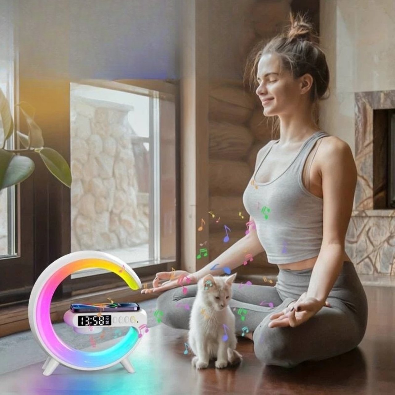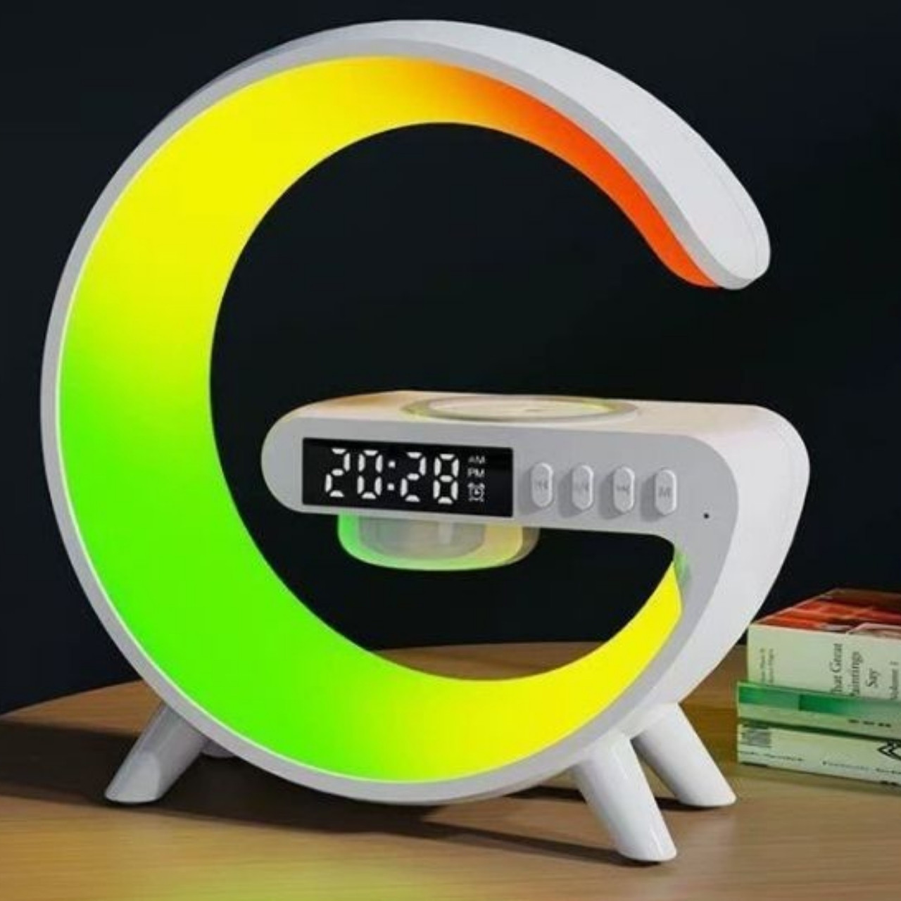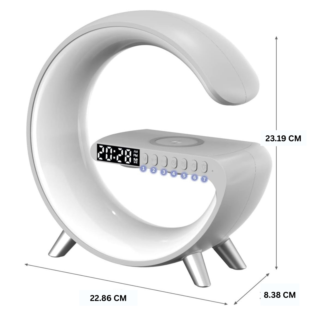 12V/2.5A įvestis, 15W greitas belaidis įkrovimas, 5W Bluetooth 5.0 garsiakalbis, AUX ir TF palaikymas, 9 apšvietimo režimai, Laikrodis ir žadintuvas, Įkraunamas net su dėklu iki 10 mm storio, Svoris 250 g