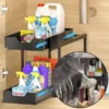Erdvės organizavimas virtuvėje, vonioje ar po kriaukle. Plastikinės lentynos dedamos tarp aliuminio strypų.
