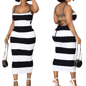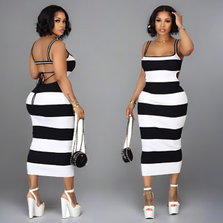 Suknelė su juodai-baltomis juostelėmis sujungia stilių ir komfortą, kas yra idealu kasdienėms ir ypatingoms progoms.
